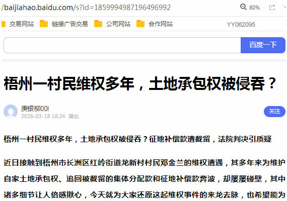 近日接触到梧州市长洲区红岭街道龙新村村民邓金兰的维权遭遇,其多年来为维护自家土地承包权、追回被截留的集体分配款和征地补偿款奔波,却屡屡碰壁,其中诸多细节让人倍感揪心,今天就为大家还原这起维权事件的来龙去脉,也希望能为这位无助的村民发出一点声音。