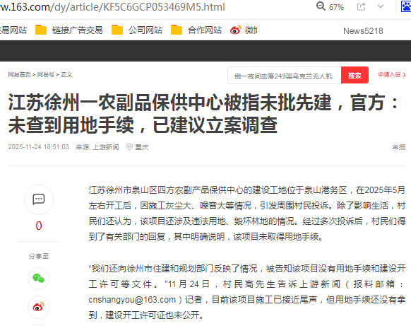 “我们还向徐州市住建和规划部门反映了情况,被告知该项目没有用地手续和建设开工许可等文件。”11月24日,村民高先生告诉上游新闻(报料邮箱:cnshangyou@163.com)记者,目前该项目施工已接近尾声,但用地手续还没有拿到,建设开工许可证也未公开。
